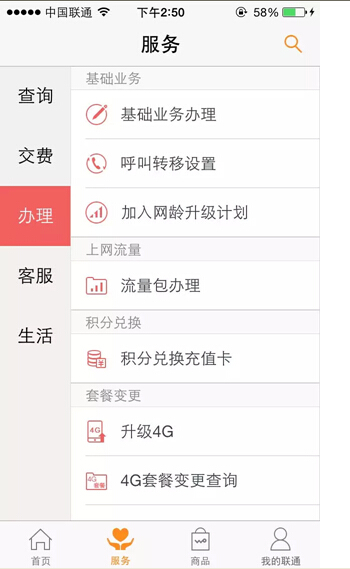 【服务办理】话费不断增加?流量越来越不够用?4G如此火!是时候换个套餐啦!登陆联通手机营业厅客户端,点击【服务】-【办理】,根据您的需求点击相应的套餐变更。手机轻轻点几点,业务办理更方便。