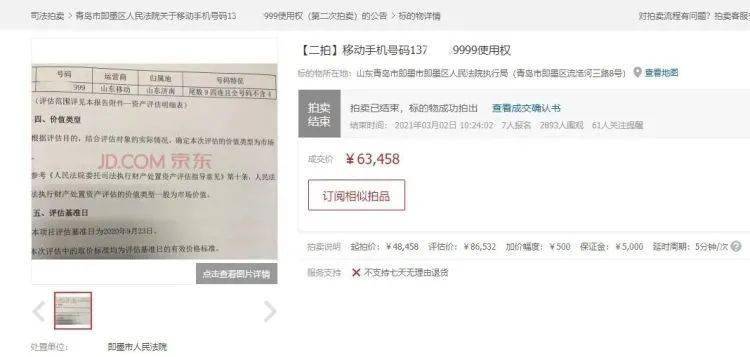 2021年3月2日,在京东司法拍卖网络平台,7名竞买人经过18轮竞价,该手机号码最终以63458元人民币的最高价成交。
