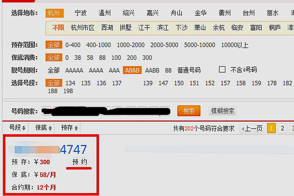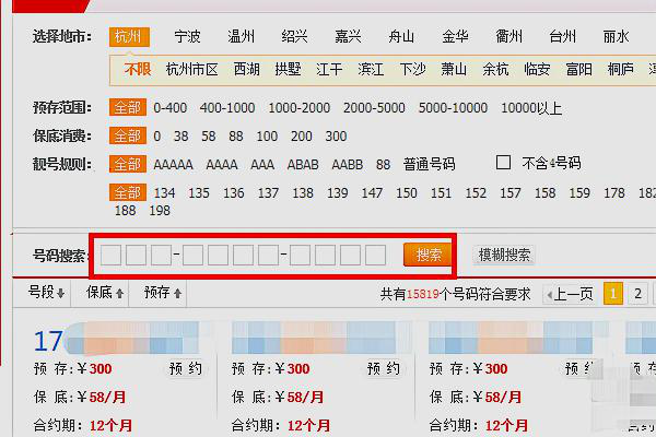 4、然后,进入号码选择界面,在号码中输入需要定制号码进行搜索。请参考下图进行操作: