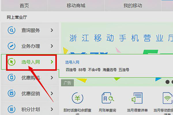 3、下一步,鼠标点击后,跳到新页面,左侧菜单栏有一个选项来【选号入网】点击进入,请参考下图进行操作: