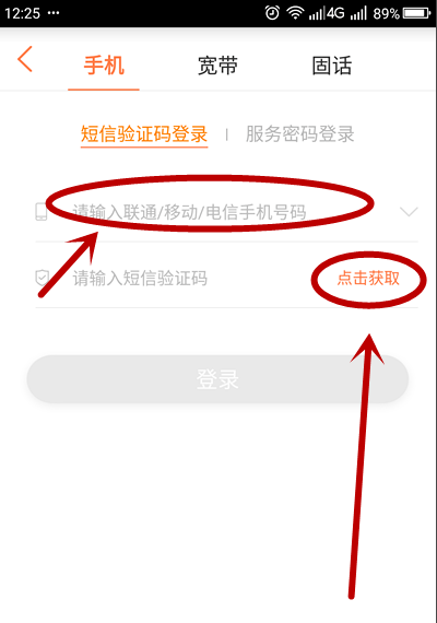 3、在弹出的登录页面,输入自己的手机号码后,单击“点击获取”;