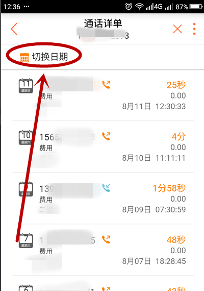 8、最后弹出的就是通话详单,包括对方电话号码、产生费用、时间等。