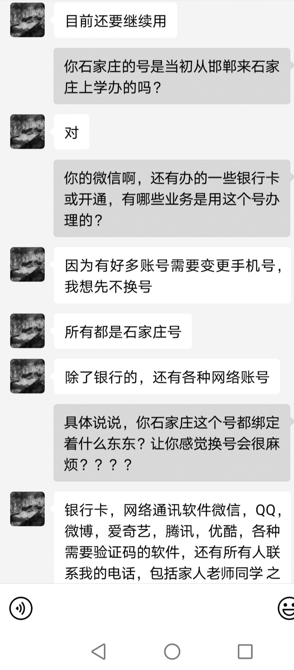 同样,对于张家口的小李来说,当初来石家庄上学的这个号她已经用了8年了。“毕业后,我去北京工作了两年,然后回到老家张家口,现在考上了公务员,可我的手机号还是8年前在石家庄上学时办的那个号。”小李说,这个号是她用自己身份证办理的第一个号,虽然离开石家庄4年了,但她仍在使用。“现在生活上偶尔会有些不便,不过还好,今后如果换号,我需要进行一大波操作解绑。”小李说。